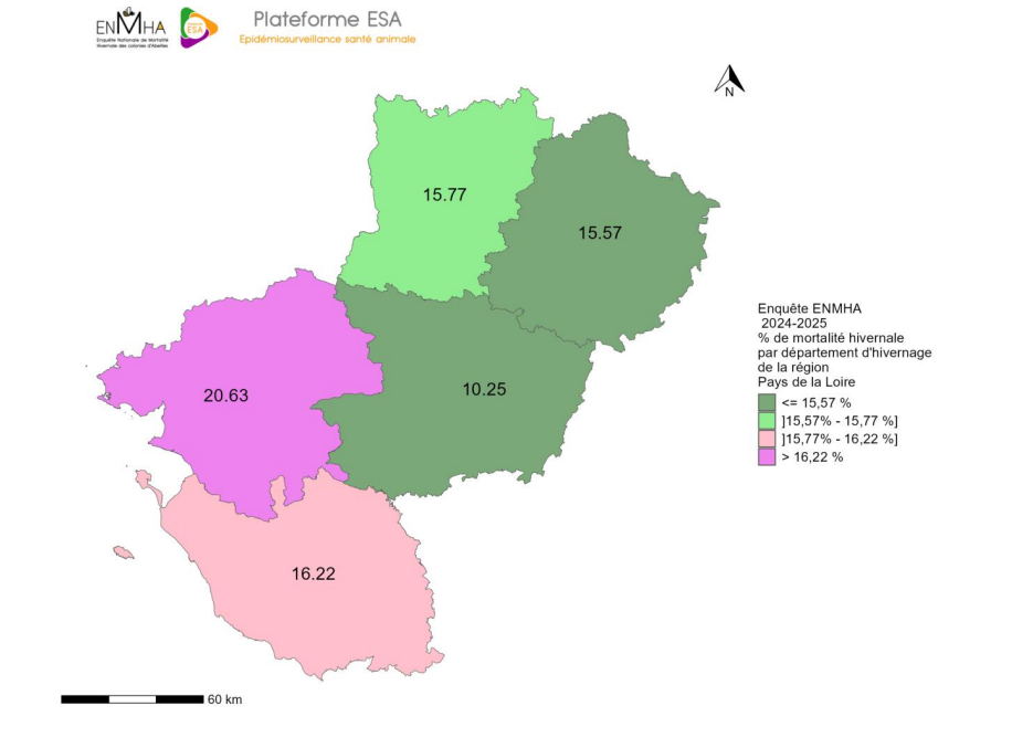 La dernière version de cette enquête, fait écho de 21,88% de mortalités hivernales de colonies durant l’hivernage 2024-2025 au niveau national et 16.17% de mortalités en Pays de la Loire.