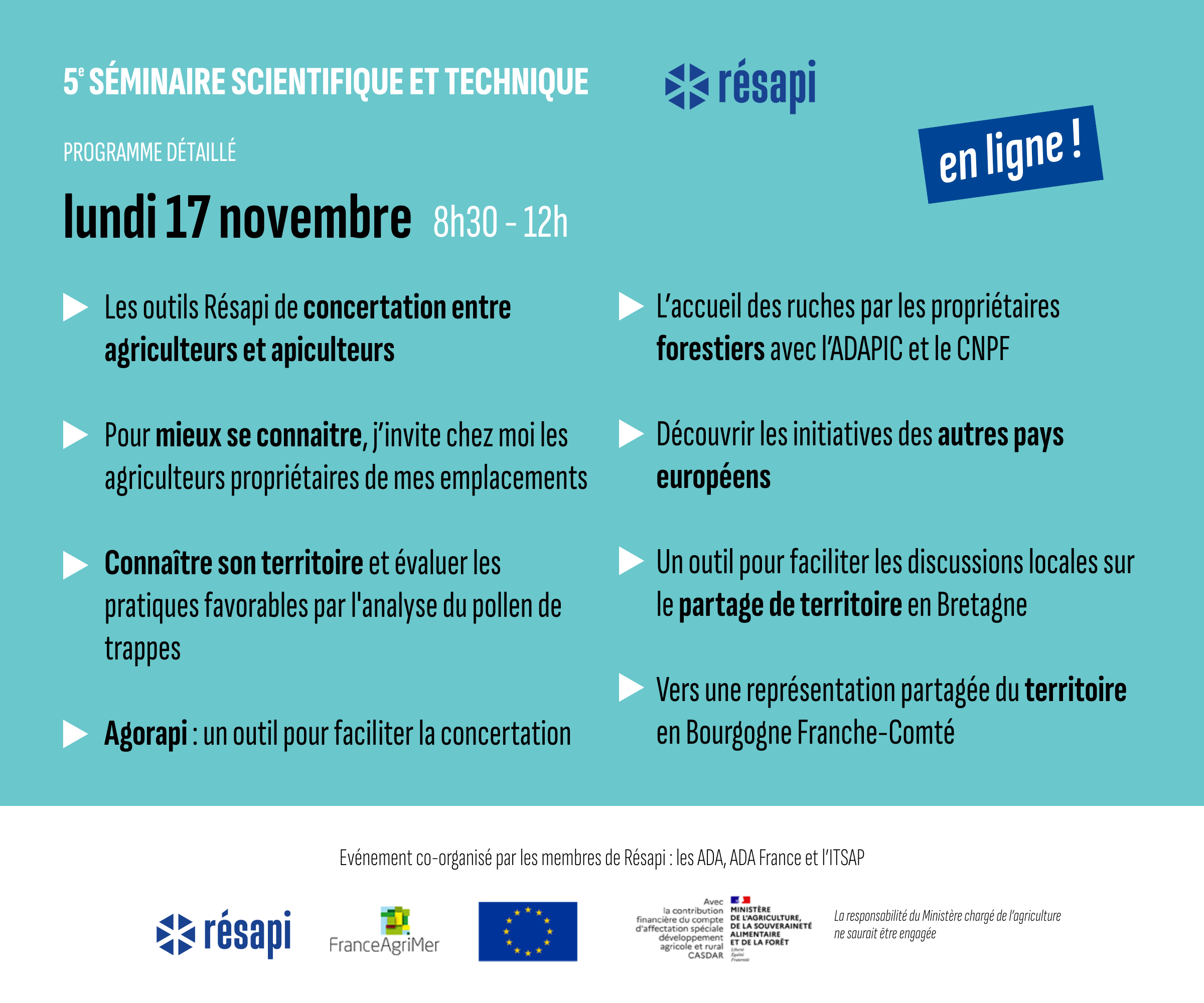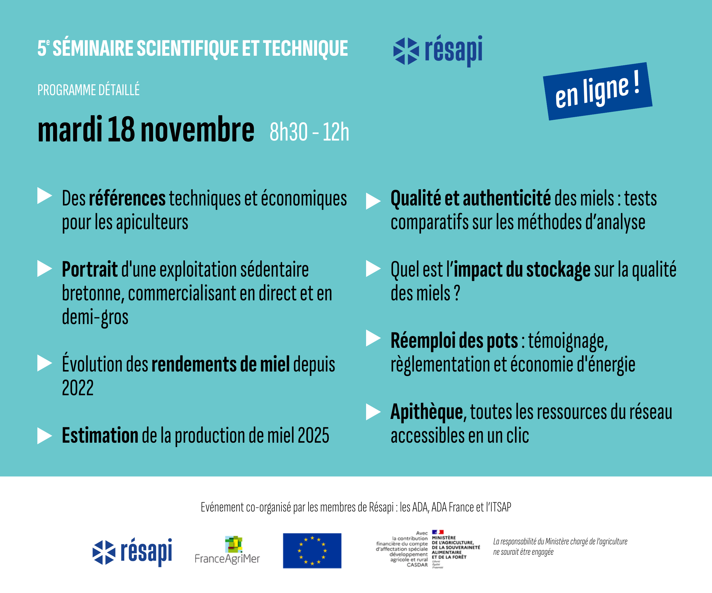 Dans un mois, le 5ᵉ séminaire scientifique et technique du réseau des ADA réunira techniciens du réseau, apiculteurs et partenaires sur trois matinées pour échanger, partager et avancer ensemble sur les grands enjeux de la filière apicole !