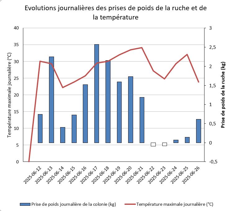Nous pouvons voir, qu’à partir du 21 juin 2026, date à laquelle la température maximale atteint 34 °C, la prise de poids journalière chute très fortement. On peut émettre l’hypothèse que les fleurs de chataîgnier n’ont plus produit de nectare à partir de cette température et montre peut être même une fin de miellée.