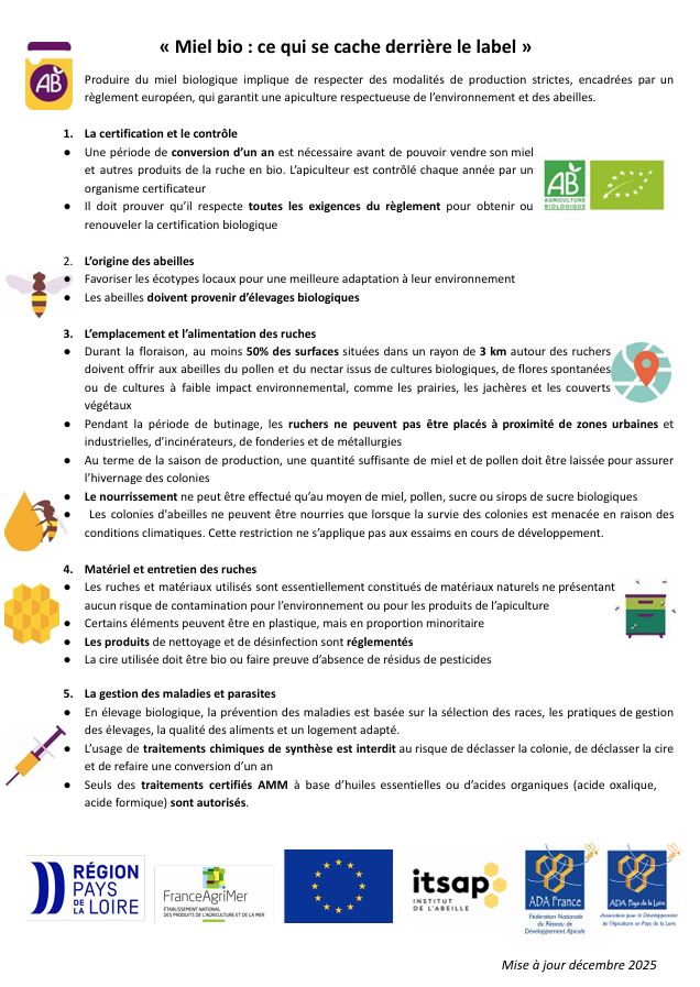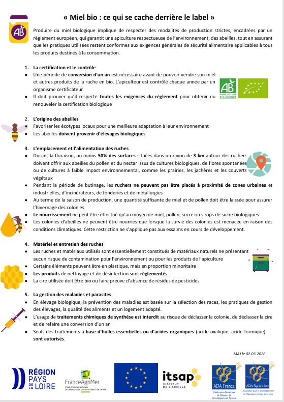 Afin d’aider les apiculteurs et apicultrices à communiquer auprès des consommateurs qui se posent des questions sur la production du miel bio. L’ADA PL met à disposition une petite affiche téléchargeable et imprimable, à distribuer à vos clients ou à afficher sur vos points de ventes.